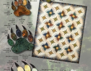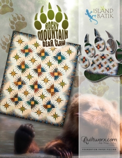 The Rocky Mountain Bear Claw is a new look to an original Quiltworx pattern named North American Bear Paw, designed by Judy and Bradley Niemeyer when our company first started in the late 1990s. Our new ‘Rocky Mountain Bear Claw’ is authentic with its (5) viscous claws and woodsy fabric line. The color layout for the quilt on the cover was created from a collection of batiks by Island Batik. The Bear Claw pattern and instructions take you back a few generations when quilt trends incorporated scrappy backgrounds and were pieced with repeating elements. The setting for the Bear Claw is unique in that the blocks are tilted in the layout, then sewn together by rotating the blocks around a 3-1/2″ square. Spiky border units were designed to square up the quilt. Floating Points, Smart Corners, and Template Layout Sheets are featured in this design, bringing a classic Quiltworx pattern up to the current design standards that our customers have come to expect when they work with one of our patterns. Also, look for quilting designs and a coordinating Table Runner and Pillow set for this adorable quilt!