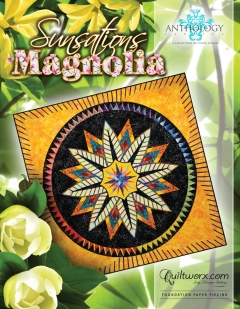 Sunsations Magnolia was designed by Judy and Brad Niemeyer as part of the Sunrise Mixer series. It includes three distinct groups to create an 80” x 80” quilt. A circular center sits in the middle of the quilt with a diameter of 62”. A 4” wide ring surrounds the center for a total increased diameter of 70”. Then, a border is added to square the quilt off at 80”. The pattern teaches many of Judy’s latest techniques for paper piecing and is fully compatible with Quiltster, meaning that you can find the layout in Quiltster and work with the program to develop your own colorway if you like. The A, B, and C groups can also be mixed and matched with other group designs in the Sunrise Mixer series to make a quilt that is truly unique to you!