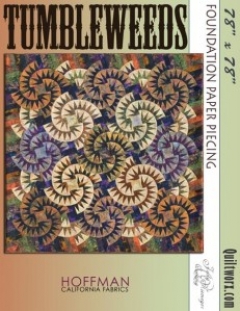 Judy and Brad designed the layout and foundation pieces for Tumbleweeds. A collection of fabrics designed by Hoffman Fabrics of California were used to make both quilts shown on the box. A sewing technique called foundation paper piecing is used when sewing the fabric pieces onto the foundation units. Curved pieceing and traditional piecing skills are required to join the units after the foundation piecing is completed.